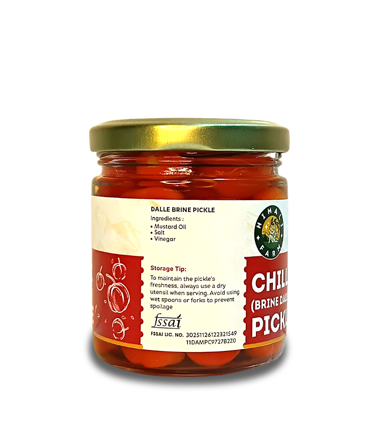 Grown in Sikkim: Cherry chilies are grown in the cool, pristine hills of Sikkim, where the mountain climate helps develop their natural heat and fresh flavor. Pickle Making: Handpicked cherry chilies are traditionally preserved in pure brine using time-honored methods, allowing the chilies to mature naturally without overpowering spices. Taste: Crisp, fiery, and tangy, this brine pickle delivers a clean, bold heat that perfectly complements everyday meals.