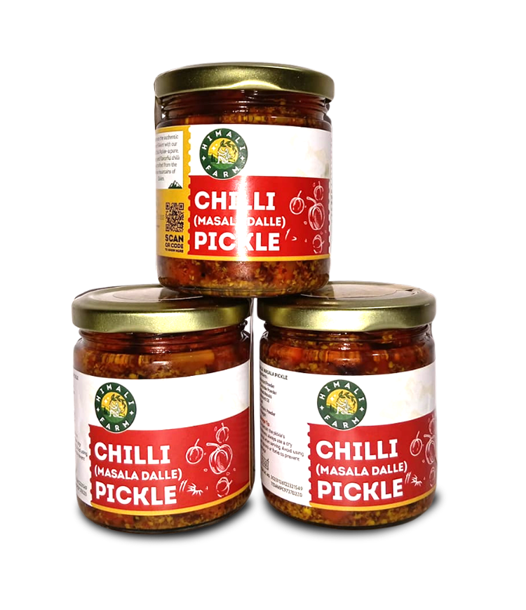 Grown in Sikkim: Cherry chilies are grown in the cool, pristine hills of Sikkim, where the mountain climate helps develop their intense heat and bold flavor. Pickle Making: Handpicked cherry chilies are traditionally pickled with a rich blend of aromatic spices and natural ingredients, allowing the masala to infuse deeply for a powerful, fiery taste.. Taste: Extra spicy, bold, and intensely flavorful, this masala pickle delivers a strong heat that is best enjoyed in small portions with everyday meals.