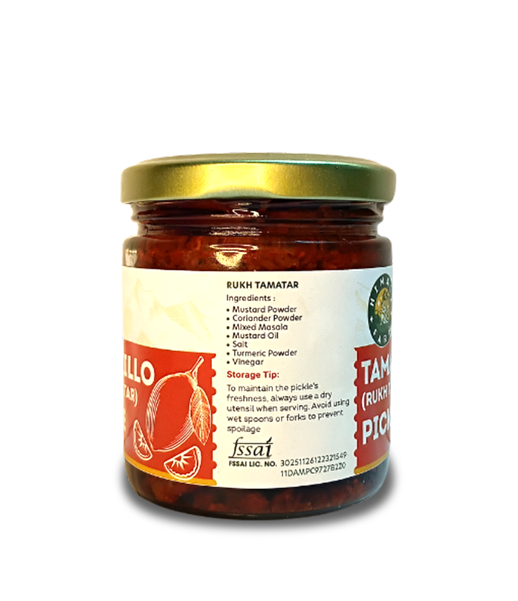 ✦Product Name: Tamarillo Pickle ✦Type: Traditional Fruit Pickle ✦Ingredients: Tamarillo (Root Tomato), natural oil, salt, aromatic spices ✦Origin: Sikkim, India ✦Taste Profile: Tangy, mildly spicy, and savory ✦Texture: Soft fruit pieces with rich pickle masala ✦Best With: Rice, rotis, dal, and everyday meals ✦Storage: Store in a cool, dry place. Use a dry spoon.